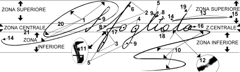 1 e 10: paraffi iniziale e finale; 2: allungo superiore (che si inserisce nella zona superiore della triplice ripartizione della scrittura); 3: allungo inferiore (che si inserisce nella zona inferiore); 4: occhiello; 5: asola; 6: esempio di asola virtuale (estremamente stretta tanto da identificarsi nell’asta); 7: puntino della "i"; 8: filetto (tratto ascendente); 9: asta (tratto discendente); 11: esempio di striature relative alla rotazione della penna a sfera; 12: esempio di "sutura" nell’ambito di una correzione (successiva al completamento della parola); 13: taglio della "t"; 14: riccio; 15: estremo di tratto finale (allungato, ma in taluni casi può presentare uncini); 16: esempio di occhiello suddiviso in più settori; 17: collegamento; 18: raccordo (tratto orizzontale); 19: asse della lettera; 20 e 21: linee che separano la zona centrale o corpo della lettera e che di fatto si identificano nelle |